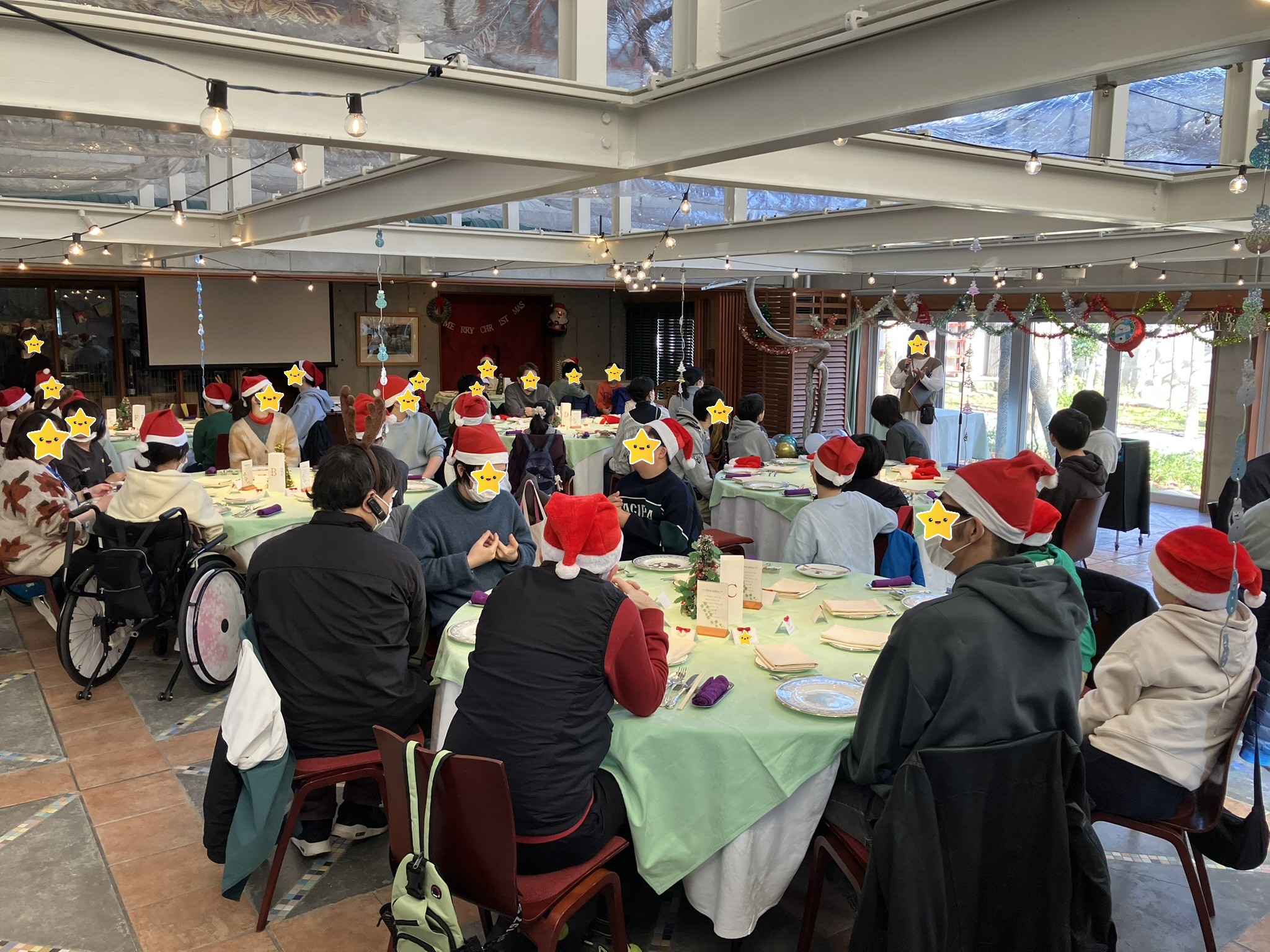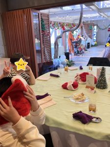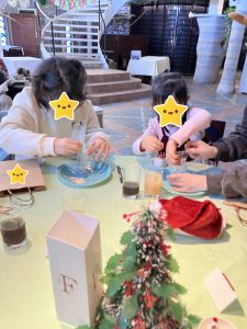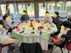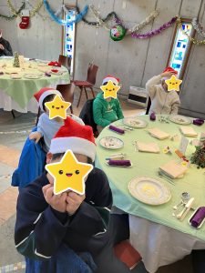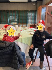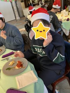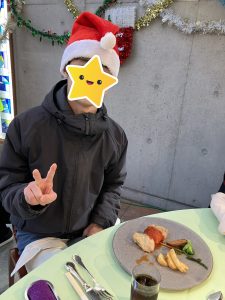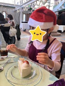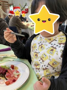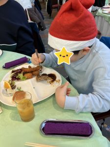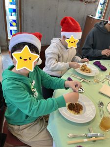 小さいお友達はお子様プレート、食べ盛りのお友達はパスタやスープ、お肉を頬張っていました。食後にはクリスマスケーキも楽しんでいました♪