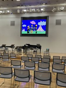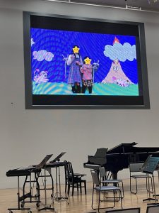 子どもたちがたペーパークラフトが動く映像に変身!ピアノ、バイオリン、チェロなどの生演奏とともにスクリーンの映像を鑑賞しました。