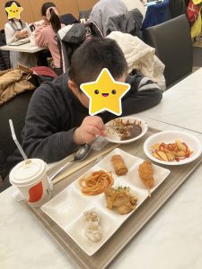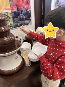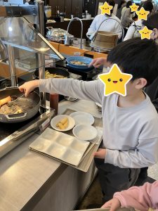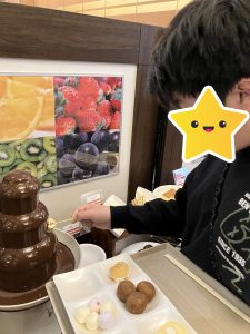 自分で麵を茹でてうどんを作ったり、「俺ピザ5枚目!」と好きな料理を何度もおかわりしたりと笑顔でバイキングを楽しむ子どもたち!デザートにはソフトクリームやチョコフォンデュを楽しむ姿も見られました😋