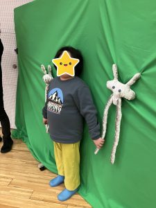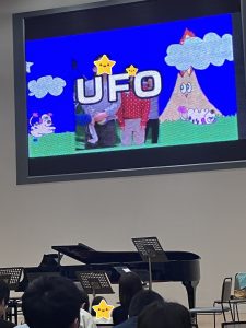 自分の作品が映し出されると周りをチラチラと見渡しながら「あれ俺の…!」と嬉しそうな顔をしたり「あー!私のお魚!」と声を出したりと子どもたちの喜ぶ顔が見ることができて嬉しい気持ちになりました。
