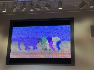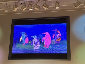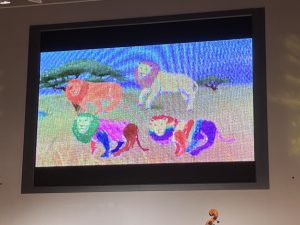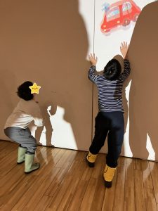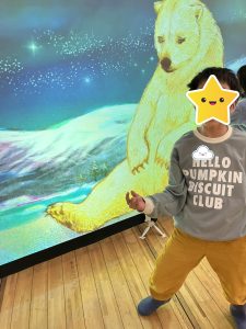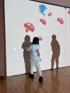 上から落ちてくるイラストを全力でタッチする子や、自分の動きを真似してくれるネズミにお辞儀をする子など、たくさんのデジタルアートを楽しむ子どもたちでしたが、中でもカメラの前に立つとUFOに連れ去られてしまうアニメーションゲームはコンサートぎりぎりまで遊ぶほど大人気でした😂